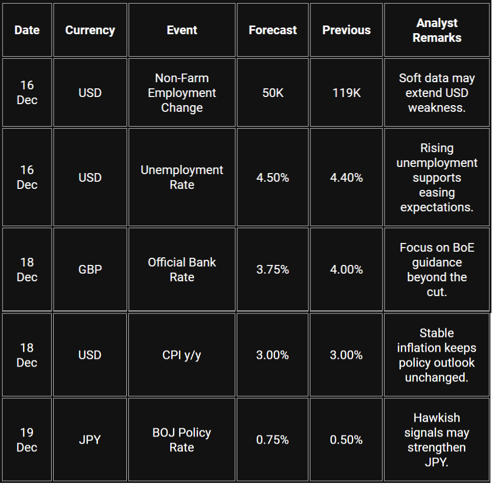 Central bank decisions add another layer of complexity. The Bank of England is expected to cut its Official Bank Rate to 3.75% from 4.00%, placing focus on forward guidance rather than the cut itself.